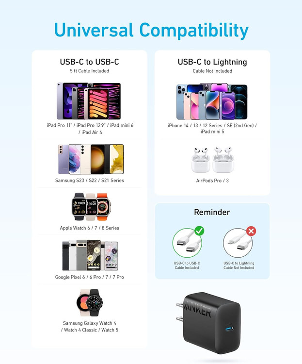 شارژر دیواری 20 وات انکر مدل B2347 با اتصال به پریز دوشاخه و تکنولوژی شارژ سریع USB PD 1.0، دارای درگاه خروجی USB Type-C، به همراه کابل USB Type-C به طول 150 سانتیمتر