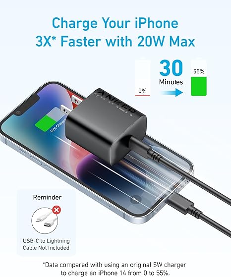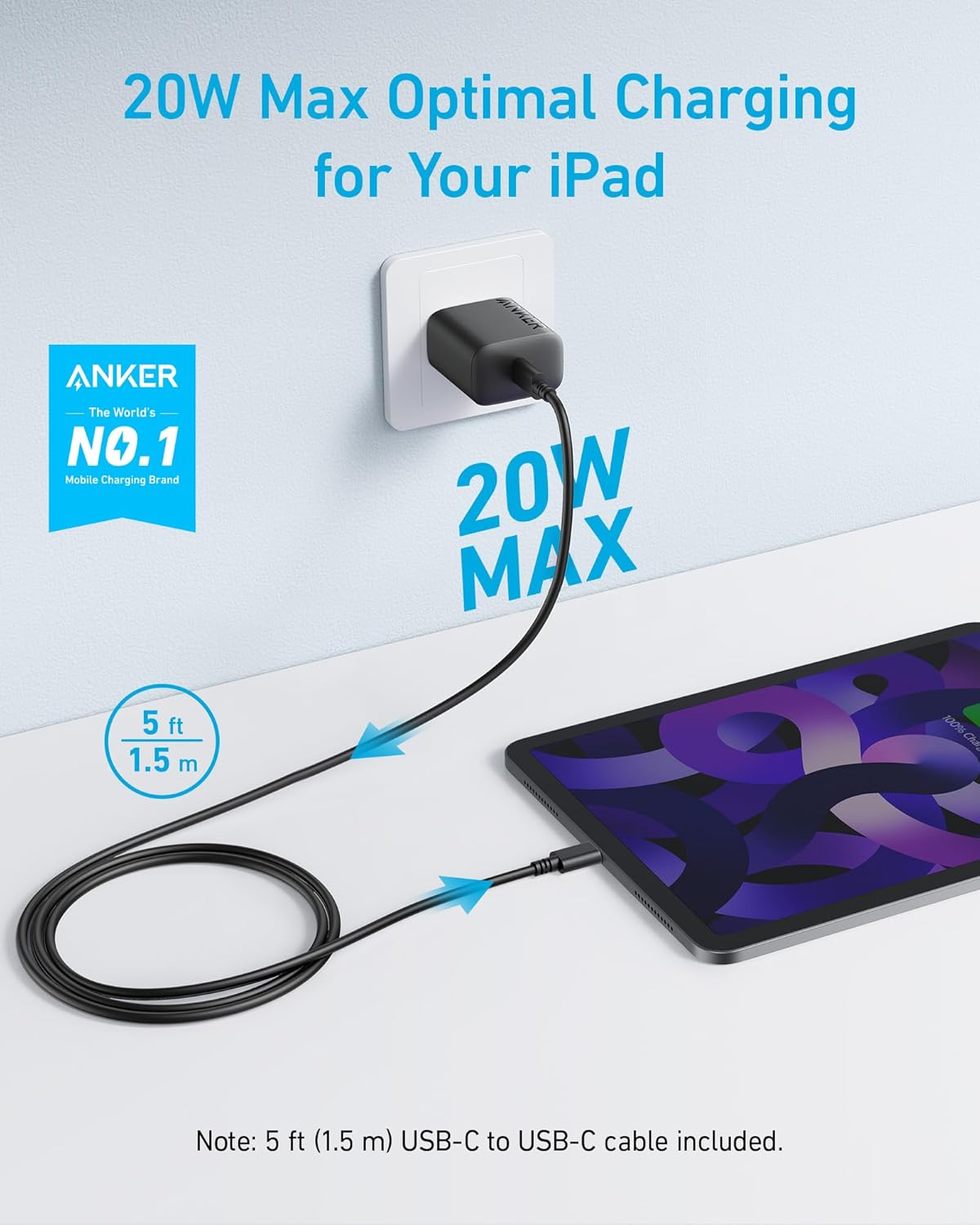 شارژر دیواری 20 وات انکر مدل B2347 با اتصال به پریز دوشاخه و تکنولوژی شارژ سریع USB PD 1.0، دارای درگاه خروجی USB Type-C، به همراه کابل USB Type-C به طول 150 سانتیمتر